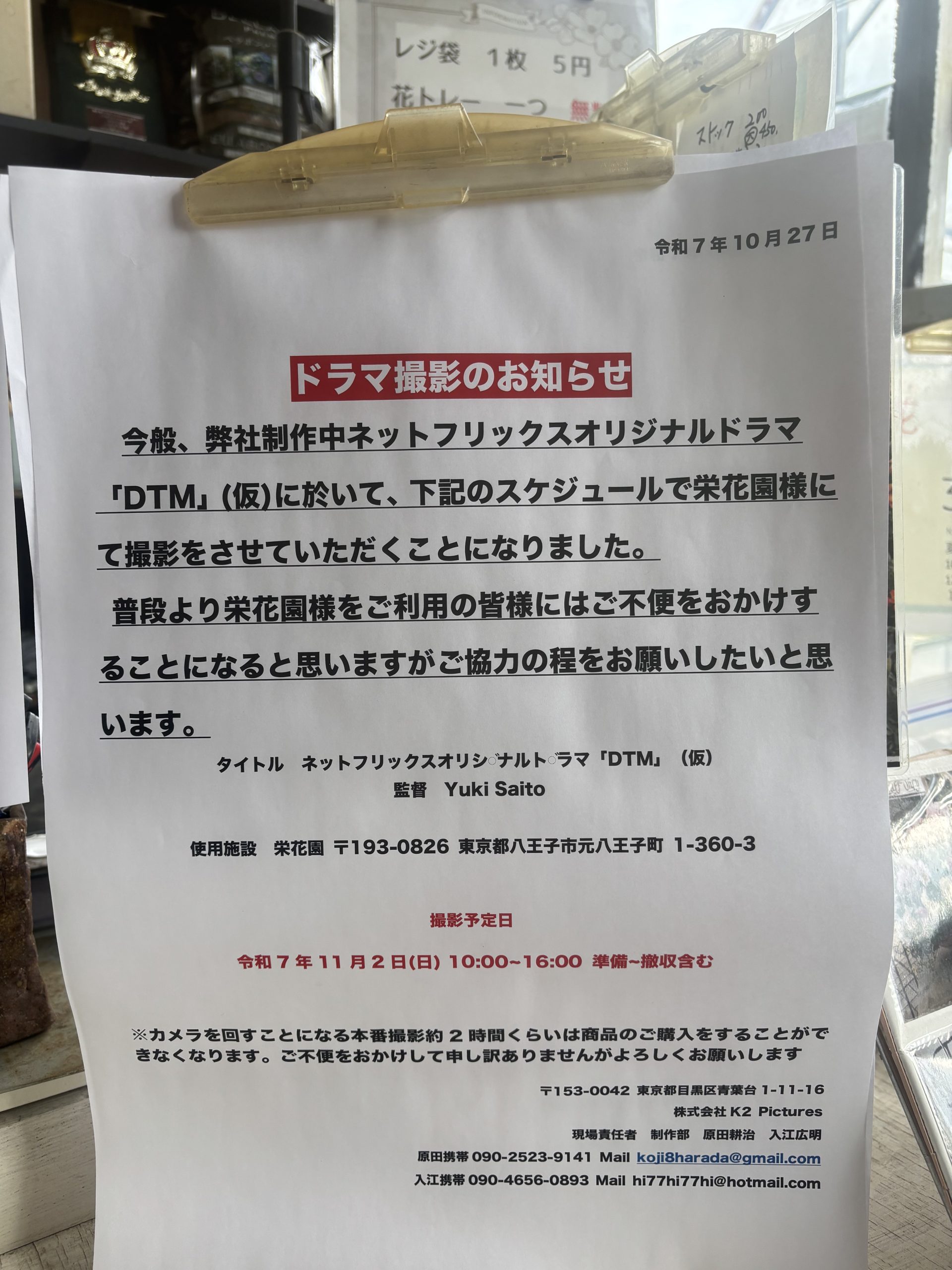 11月2日(日)にてネットフリックスのテレビドラマ撮影のロケ現場になりました、そのため当日は完全閉店とはなりませんが、購入に制限がかかるためご迷惑をおかけしします、本番撮影の約2時間は購入不可となります、また撮影時は車の駐車も不可となりますのでご了承下さい。